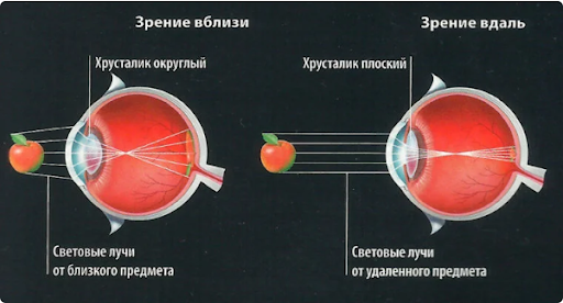 Когда мы видим, лучи света преломляются всей передней оптической частью глаза. Финишное преломление света, попадающего на сетчатку, осуществляется хрусталиком. Именно от его него зависит, какой именно предмет будет виден четко. В изменении точки фокусировки участвует цилиарная мышца хрусталика и его связки. Они регулируют кривизну (выпуклость) хрусталика.